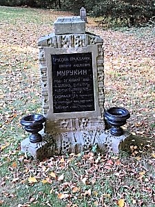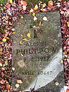 Stehender schlichter großer Sandstein mit Kyrillischem Text, darunter: Hier ruht in Gott…