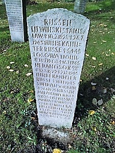 Stehender schlichter Grabstein mit Kyrillischem Text und deutschen Text darunter: Hier ruht in Gott…