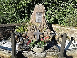 Deutsche Kriegsgräberstätte des Krieges 1870/71 und Denkmal aus Feldsteinen mit aufgesetztem Findling und angebrachter Metalltafel für das Dragoner Regiment No. 5 bei der Belagerung der Festung von Bitsch.