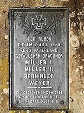 Hier ruhen die am 7. Aug. 1870 für`s Vaterland gefallenen Dragoner (Namen) Zum Gedächtniss gewidmet von den Kameraden des Rhein. Drag. Regt. No.5
