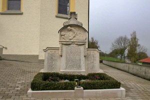 Denkmal auf dem Friedhof, sowie ein einzelnes Kriegsgrab.