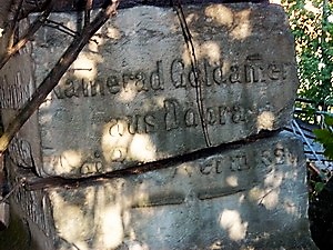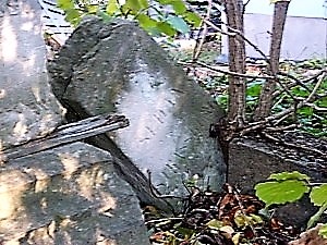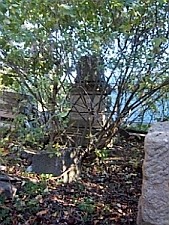 umwuchert und von Unrat umgeben. Der Sockel mit den Inschriftenseiten steht noch,