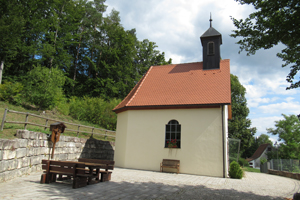 Die Gedenktafeln aus Sandstein sind in die Außenwand der Ortskapelle eingelassen.