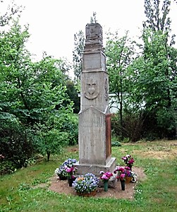 Mit Tatzenkreuz gekröntes Steindenkmal auf dem Friedhof, vor der Kirche. Die Gefallenen des 2. Weltkriegs wurden auf nachträglich angebrachten Tafeln verzeichnet.