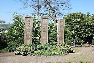 Holzstele Mitte: Zum Andenken an unsere Gefallenen. Niemand hat größerer Liebe denn die, daß er sein Leben läßt für seine Freunde Joh 15,13