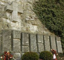 angebracht. Darüber ist ein großes Steinkreuz in die Mauer eingelassen.