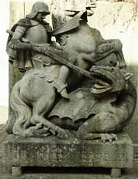 Neckarstraße steht ein Denkmal, auf dem St. Georg mit dem Drachen kämpft. Auf