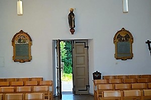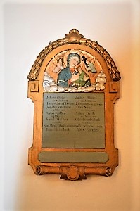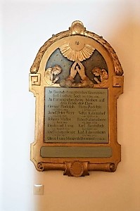 Tafel mit den Namen der im Zweiten Weltkrieg Gefallenen: Gedenke der Toten des Krieges. Sie starben in CHRISTUS und ruhen im FRIEDEN. Amen. (Namen) Allen, die wir noch vermissen, sei CHRISTUS Bruder und Herr. (Namen)