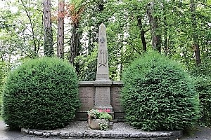 Bei der Kirche: Gedenkwand und in der Mitte Säule