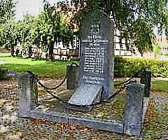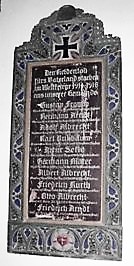 Denkmals-Stele auf einem kleinen Platz an der alten Dorfstraße, umgeben von vier quadratischen Granitsäulen, die mit Eisenketten verbunden sind. In die Stele ist ein eisernes Kreuz mit den Jahreszahlen 1914-1918 eingehauen. An die Stele angelehnt ist eine Granitplatte mit den Namen der Gefallenen des 2.Weltkrieges, überschrieben mit den Jahreszahlen 1939-1945. Gedenktafel in der Kirche. Soldatengräber. Daten aus Archiven.