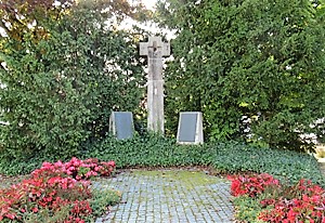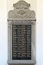 Denkmal bei der Kirche St. Martin. Die Opfer des 2. Weltkriegs sind auf Platten zu beiden Seiten eines hohen Steinkreuzes verzeichnet. Die Gefallenen des 1. Weltkriegs stehen auf einer Gedenktafel in der Kirche.