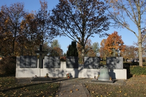 Im Friedhof leicht gebogene Wand mit aufgesetzten Gedenktafeln, seitlich davor Glocke. Zusätzlich Hinweise zu Soldaten von privaten Gedenksteinen.