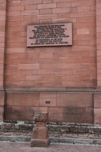 Tafel: Zum Gedenken an die ehemalige jüdische Gemeinde in Kehl. Seit 1889 stand an der Ecke Schul-Kasernenstrasse die Synagoge. Sie wurde am 9.11.1938 zerstört. Die jüdischen Mitbürger wurden verschleppt und grösstenteils ermordet. Die Erinnerung an die Opfer ist Mahnung und Auftrag, die Würde des Menschen zu schützen.
