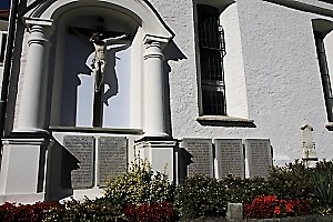 Aussen an der Kirche: fünf Gedenktafeln und ein Hochkreuz. Ein einzelnes Kriegsgrab im Friedhof und zusätzlich Hinweise zu Soldaten von privaten Gedenksteinen.