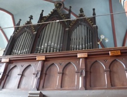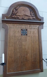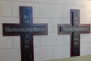 Unter den Namenstäfelchen an der Empore der Kirche waren früher Ehrenkränze angebracht.
