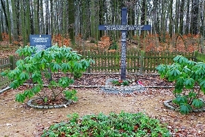 Ein etwa 2,5 m großes Holzkreuz, daneben eine Gedenktafel