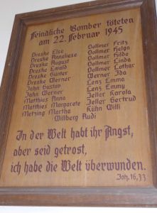 Kirche Tafel 2: Feindliche Bomber töteten am 22. Februar 1945: (Namen) In der Welt habt ihr Angst, aber seid getrost, ich habe die Welt überwunden. Joh. 16,33