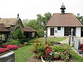Gedenktafel im Eingangsbereich des Friedhofsgebäudes mit Fotos der im 2. Weltkrieg gefallenen Soldaten, sowie eine Granitplatte auf der die Namen der Gefallenen und Vermissten beider Weltkriege in goldener Schrift vermerkt sind.