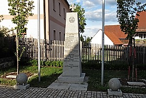 Restauriertes Steindenkmal mit krönendem Tatzenkreuz im Ort.