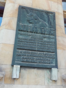 Gedenktafel an dem Justizzentrum Eike von Repgow. Die Tafel wurde vom Bildhauer Walter Bischof um 1960 geschaffen. Sie erinnert an die Menschen,