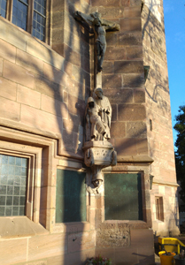 Gedenktafeln unterhalb einer Sandstein-Figurengruppe an der Außenfassade der evangelischen Kirche St. Nikolaus und Ulrich für die Gefallenen des 1. Weltkriegs aus Mögeldorf, Hammer, Laufamholz, Malmsbach, Unterbürg und Zerzabelshof. In der Kirche eine private Gedenktafel mit Wappen für Dr. Walter von Forster.