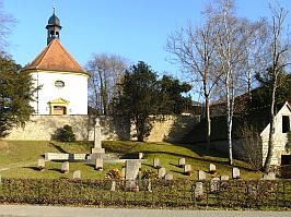 Im Aufgang zum Friedhof befindet sich das Ehrenmal. Oben eine rechteckige Steinsäule mit einem Steinkreuz als Abschluss. Davor sind eine Inschriftenplatte, sowie Namensgedenksteine in mehreren Reihen aufgestellt.