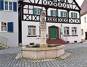 Brunnen zum Gedenken an den 1. Weltkrieg in der Ortsmitte. Ein Adler, der die Weltkugel in den Krallen hält, sitzt über einem Relief, das abgekämpfte Soldaten und wartende Angehörige zeigt.