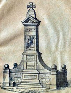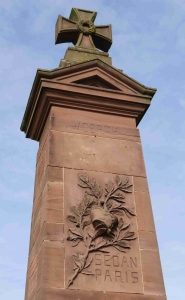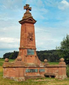 aus rötlichem Sandstein, bekrönt mit einem „Eisernen Kreuz“. Auf der Vorderseite eine
