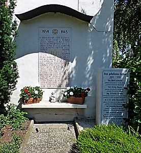 Gedenktafel an der südlichen Außenwand der evangelischen Kirche St. Georg und Jakobus Maior für die Opfer des 2. Weltkrieges aus der ehemaligen Gemeinde Neuenmuhr. Rechts davon steht eine Steintafel für die Opfer des 1. Weltkrieges.