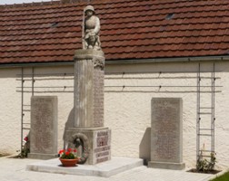 Ein Soldat kniet auf dem Denkmal des 1. Weltkriegs. Auf Steintafeln, die beiderseits davon aufgestellt wurden, sind Namen und Daten des 2. Weltkriegs verzeichnet. Das Denkmal wurde 2013 vom Dorf auf den neu gestalteten Friedhof verlegt.