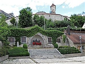 Am Kirchvorplatz führen mehrere Stufen hoch zu der Steinmauer in die die Gedenktafeln