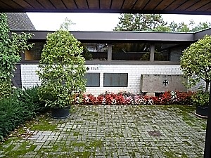 Aussegnungshalle auf dem Friedhof: An der Außenwand drei Metalltafeln mit den Namen der