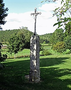 Nitzlbuch (1870/71), Stadt Auerbach i.d.OPf., Landkreis Amberg-Sulzbach, Oberpfalz, BayernPLZ 91275 Auf einer Wiese steht ein verwitterter Naturstein mit krönendem Kruzifix. Nur die Jahreszahl 1871 ist noch lesbar.