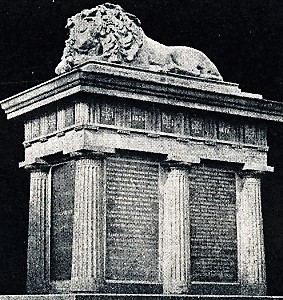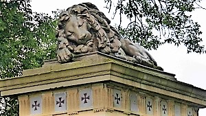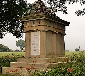 Denkmal für die Gefallenen des 1. Deutschen Armeekorps im Kriege 1870/71, Quader in Form eines Tempels mit krönender Löwenfigur. Oberteil umrandet von kleinen Eisernen Kreuzen (große Inschriftentafeln heute nicht mehr vorhanden).