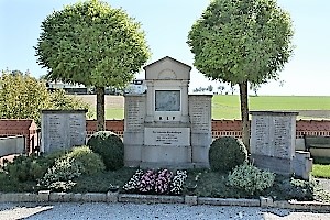 Denkmal im Friedhof und an mehreren Stellen Kriegsgräber. Zusätzlich Hinweise zu Soldaten von privaten Gedenksteinen.