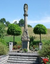 Steinsäule mit einer Engelsfigur. Am Sockel der Säule befinden sich zwei Stahlhelme mit Handgranaten, dazwischen gekreuzte Seitengewehre auf Eichenlaubblättern.