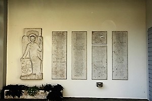 Gedenktafeln an der Abdankungshalle; zusätzlich Hinweise zu Soldaten von privaten Gedenksteinen