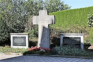 Bei der Kirche stehen zwei Namensplatten und dazwischen ein Steinkreuz. Zusätzlich Hinweise zu Soldaten von privaten Gedenksteinen