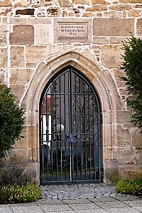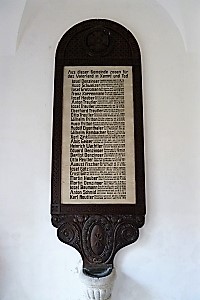 Hölzerne Gedenktafel in einem verschlossenen Raum außerhalb der Kirche St. Erasmus