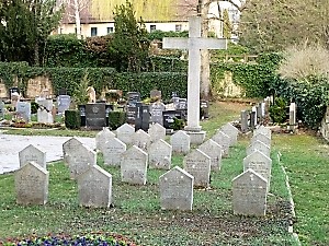 Kriegsgräberanlage auf dem Stadtfriedhof für gefallene und verstorbene Soldaten, zumeist in den beiden Plochinger Lazaretten. Auf einigen wenigen Grabsteinen sind die Namen und Daten der Bestatteten kaum oder gar nicht mehr vollständig zu lesen.