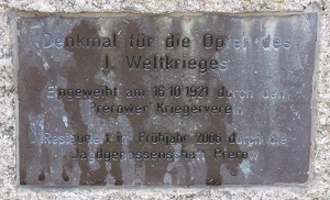 Denkmal für die Opfer des I. Weltkrieges Eingeweiht am 16.10.1921 durch den Prerower Kriegerverein Restauriert im Frühjahr 2006 durch die Jagdgenossenschaft Prerow