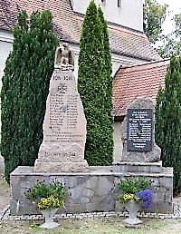 Auf dem Friedhof neben der Kirche auf einem Sockel zwei nebeneinander stehende Felsspitzen: für den 1. Weltkrieg: Geglättete Vorderfront mit eingearbeiteten Namen, obenauf ein Adler; für den 2. Weltkrieg: Eine vorgehängte Platte mit eingearbeiteten Namen