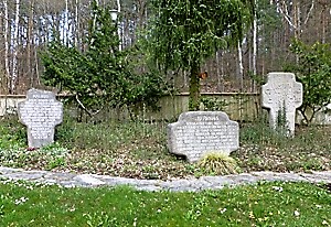 Drei Gedenksteine in Kreuzform auf dem Friedhof tragen die Namen der Gefallenen beider Weltkriege.