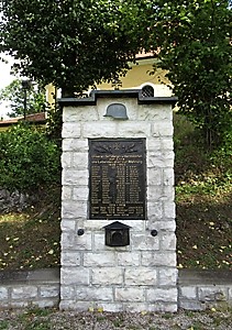Gemauertes Denkmal mit Inschriftenplatte unterhalb der Kirche St. Magdalena, die außerhalb des Ortes steht.