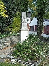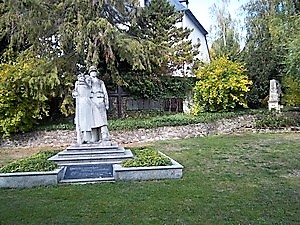 Vor der Kirche befindet sich die gepflegte Anlage. Zentral steht eine ca. drei Meter hohe Plastik eines Soldaten, welcher Frau und Kind beschützt. Davor liegt eine Widmungsplatte. An der dahinterliegenden Kirchenmauer befinden sich zwölf Namensplatten für die Gefallenen des 1. Weltkriegs und sechs Platten für die des 2. Weltkrieges. Etwas rechts davon steht noch ein Obelisk (1870) . Die Felder sind allerdings so verwittert , dass überhaupt nichts mehr erkannt werden kann.