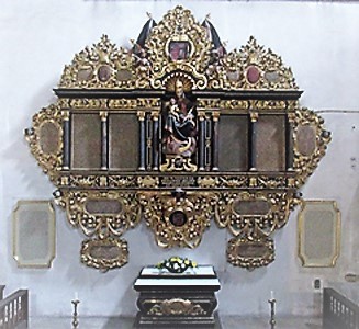Zwei Tafeln zu beiden Seiten der kunstvoll geschnitzten Holztafel für den 1. Weltkrieg