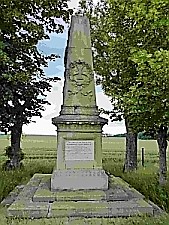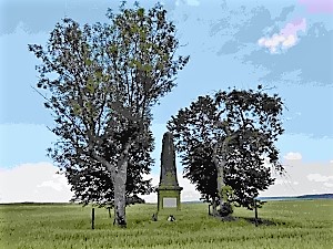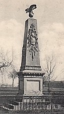 Denkmal für die Gefallenen Angehörigen des Kürassier Regiments Nr. 7 und des Ulanen Regiments Nr. 16 (Kavallerie Brigade von Bredow) im Kriege 1870/71. Obelisk mit eingelassenen Tafeln nahe der Straße nördliche von Rezonville in einem Feld. Im oberen Teil Verzierungen mit Kürassier Harnisch und Helm, EKs und Schwertern (früher gekrönt von einem Adler).
