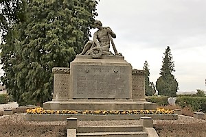 Im Friedhof; Denkmal auf einem Podest, oben mit Steinplastik; zusätzlich Hinweise zu Soldaten von privaten Gedenksteinen