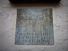 Außenwand der Kirche St. Ambrosius. Wandplakette für die Gefallenen beider