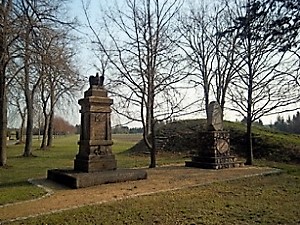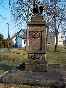 nebeneinander zwei Denkmale. Ein Obelisk aus Sandstein mit obenauf throhnendem Adler erinnert
